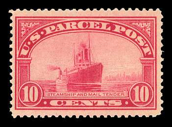 Scott #Q6 Carmine [1913 10c (shades) Parcel Post, Steamships] NEVER HINGED with Average-Fine centering (perforations on left just barely touch frameline). Wonderfully fresh with pristine original (of course) gum, excellent perforations, and intense color. While better centering would certainly be preferable, the price is very reasonable. (Scott 2025 NH value $90 for "normal VF".)