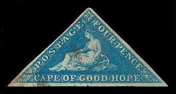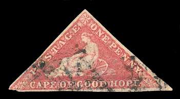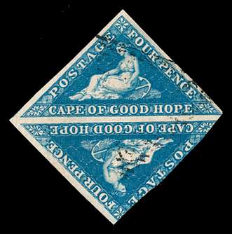 Scott #2 (SG #4). Two 4d Deep Blue Cape Triangles on lightly blued paper, tied to 1855 double weight folded letter from Port Elizabeth. One stamp is Fine, the other VF with clear to huge margins, slightly overlapping when affixed. Complete contents; two page business letter. Red wax seal of Blaine and Company on reverse. SG 2009 catalog value for SG4 on cover plus the additional single is "from" £600 = $930 [7/10]. A scarce and impressive piece of classic British Colonial postal history.