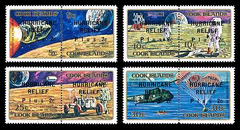 Scott #B113, B115, B117, B123, B129 blocks of 4, (1987 "HURRICANE RELIEF" Overprints on 1986 Scott #897-901 HALLEYS COMET.) The complete comet set with overprints.